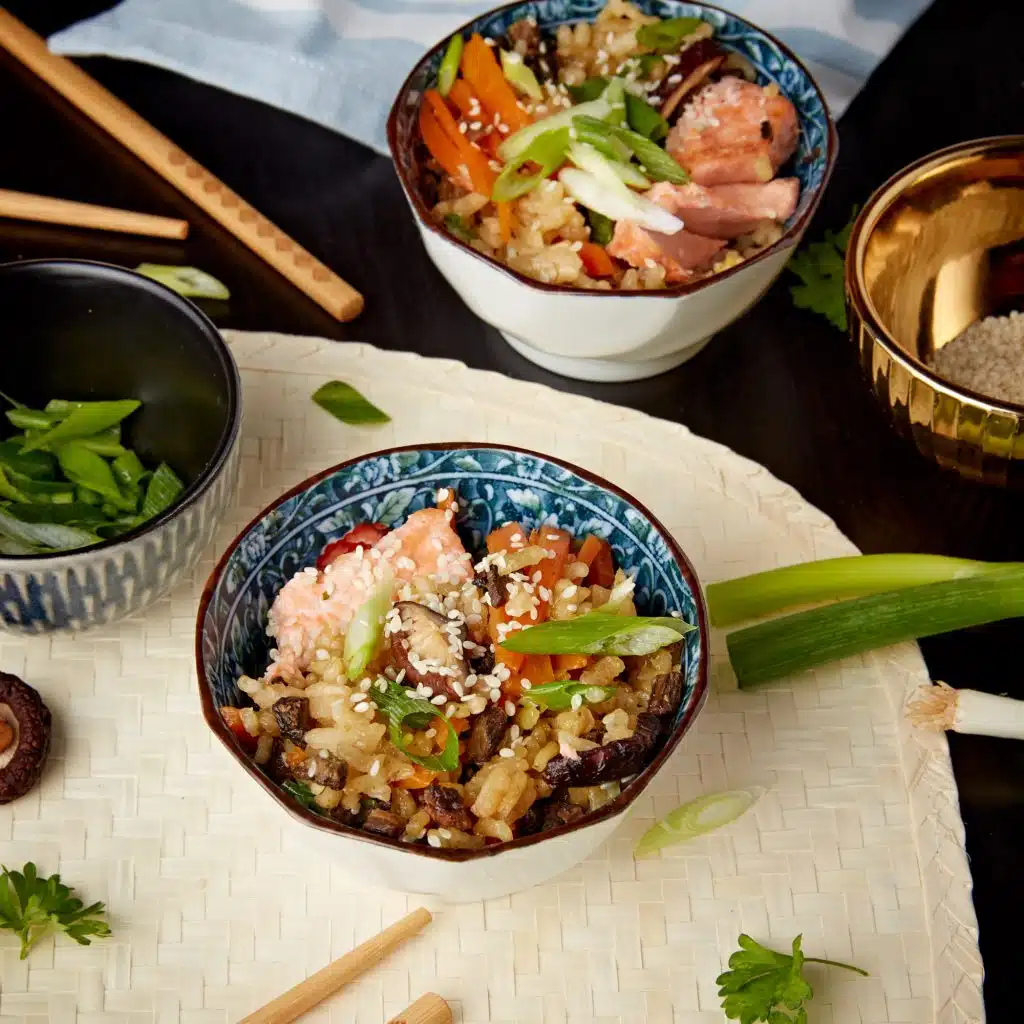 Japanese rice dish in which short-grain rice is cooked with vegetables, mushrooms, seafood, or meat. It’s usually seasoned with Japanese stock (dashi) and soy sauce. In this recipe we use Tuna or Salmon and prepare it all in a rice cooker.
