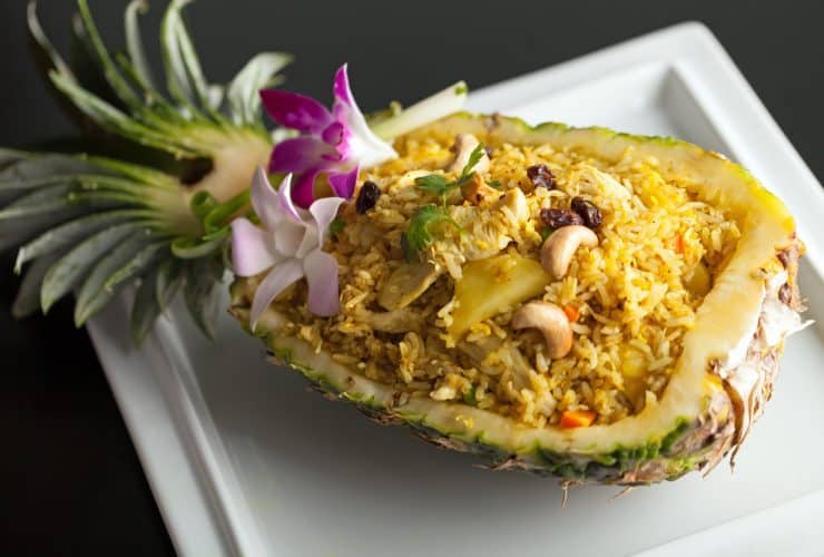 Savoury jasmine rice combined with juicy sweet pineapple and spices sounds like an unusual combination but it makes a terrific tropical dish. Decorate with spring onion and chilli scattered on top. Canned pineapple will also be okay in a pinch. You won’t get the same wow effect but it will taste just as good. ...