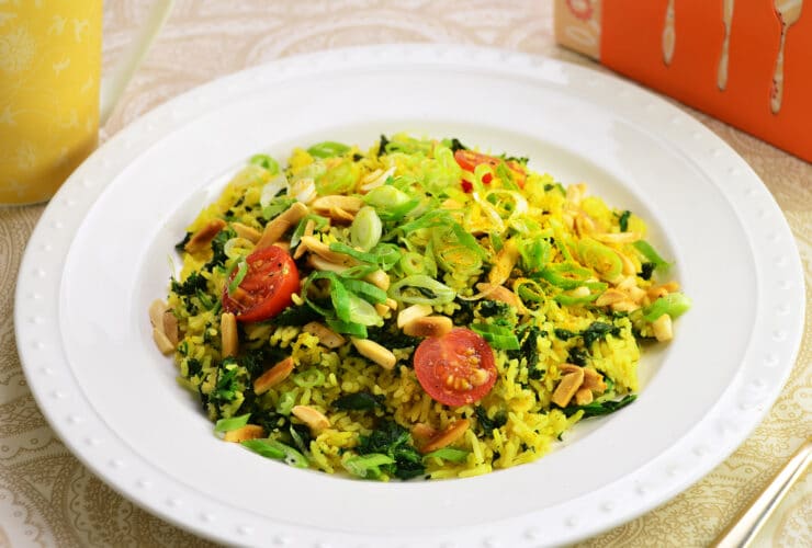 We cook basmati rice with Madras curry powder, onions, garlic and lentils, then mixed in fresh tomatoes, green onions, spinach and almonds to give a light, healthy and spicy sensory overload. ...